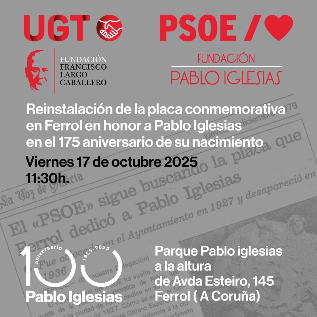 El viernes 17 de octubre de 2025, a las 11:30 horas, Ferrol volverá a albergar un símbolo de memoria: la placa conmemorativa dedicada a Pablo Iglesias, en un acto cargado … Read More