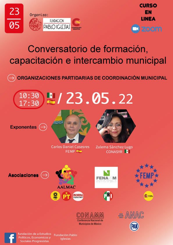 Hoy 23 de mayo, a las 10:30 h en Ciudad de México, las 17:30 h en Madrid, tendrá lugar en línea el conversatorio de formación, capacitación e intercambio municipal. Organizaciones … Read More