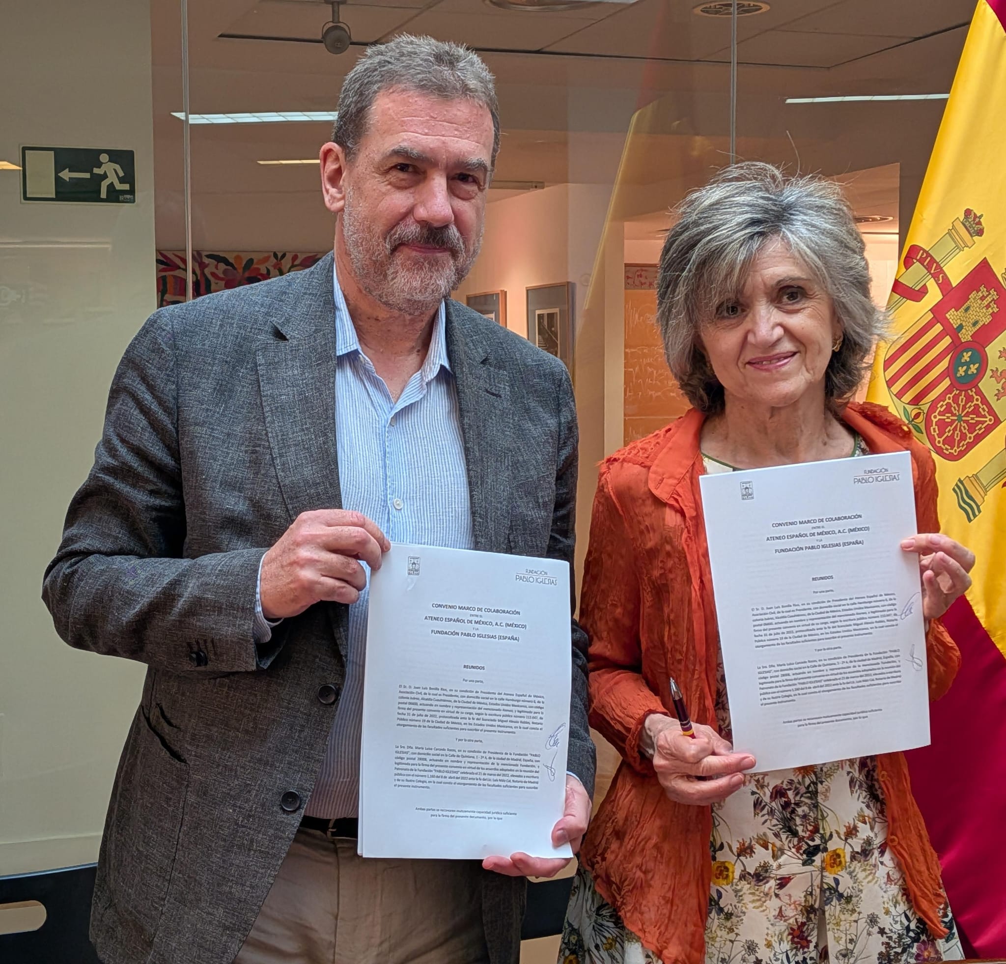 El pasado 20 de junio de 2025, Juan Luis Bonilla Rius, presidente del Ateneo Español de México, durante su visita a España ha aprovechado la ocasión para firmar en Madrid con María Luisa Carcedo Roces, presidenta de la Fundación Pablo Iglesias, un convenio marco de colaboración. Este acuerdo servirá como base para fortalecer y dar continuidad a la histórica colaboración entre ambas instituciones en diversos ámbitos, con especial énfasis en las actividades de promoción y difusión de la memoria democrática.