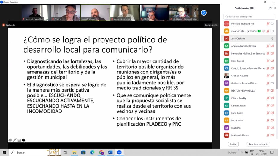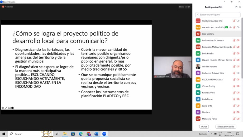 El 9 de noviembre tuvo lugar la quinta sesión de la Escuela Municipal Socialista 2023, titulada Elementos de comunicación social y política, que hemos organizado con el Instituto Igualdad y el Partido Socialista de Chile contando con la financiación del Ministerio de Asuntos Exteriores, Unión Europea y Cooperación.