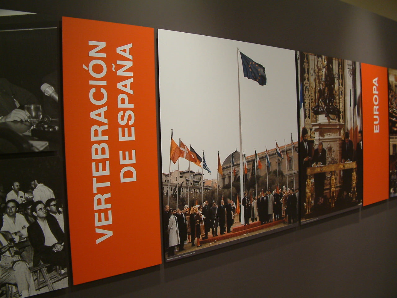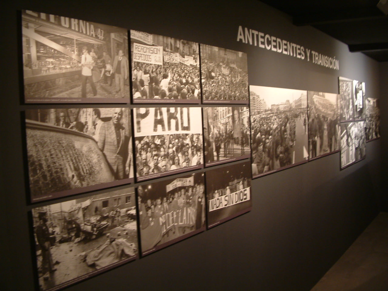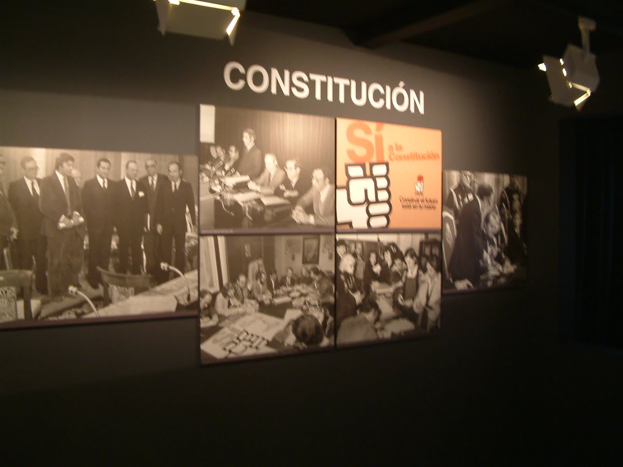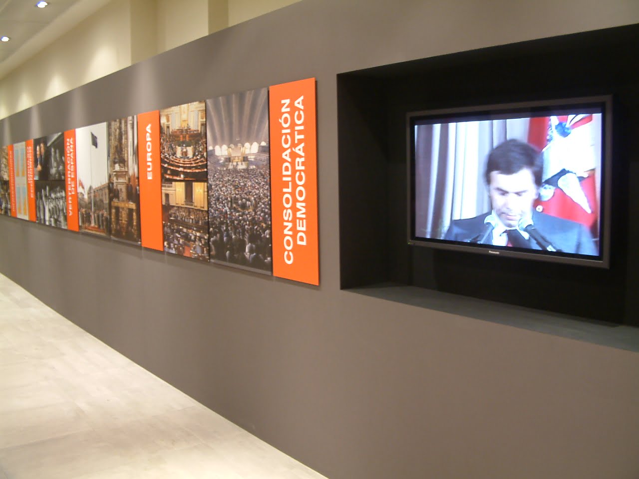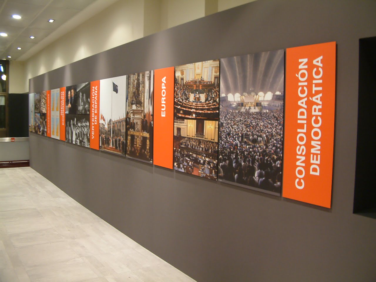 La exposición estuvo estructurada en diferentes ámbitos cronológicos: Antecedentes y transición, Constitución Española, consolidación democrática,  y el papel que los gobiernos socialistas tuvieron en la vertebración de España, las políticas sociales, el papel del ejército, el desarrollo de infraestructuras, la nueva situación de España en el mundo, el impulso económico, el desarrollo europeo y la consolidación democrática.