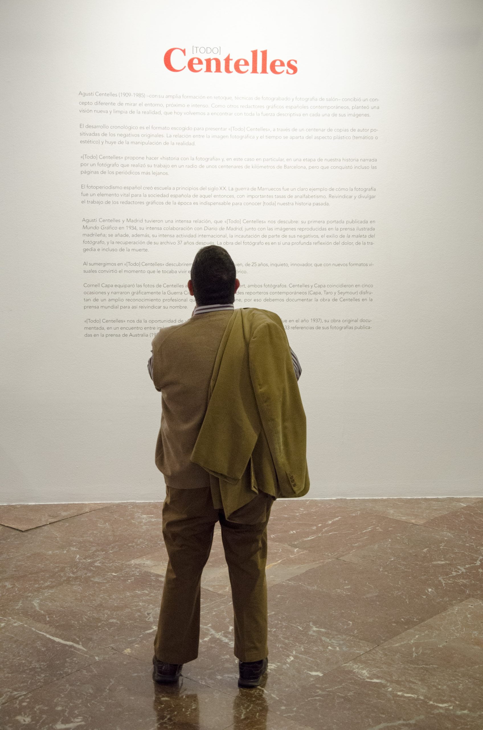 Todo [CENTELLES] presenta una retrospectiva de la obra de Agustí Centelles, el llamado Robert Capa español . A partir de la colección particular de Octavi Centelles, hijo del autor, la Fundación Pablo Iglesias produce una exposición en la que se incorporan piezas reveladas por Agustí en 1975, cuando regresa a Francia para recuperar su archivo tras la muerte del dictador, además de documentación gráfica con publicaciones españolas e internacionales y material fotográfico de la época.