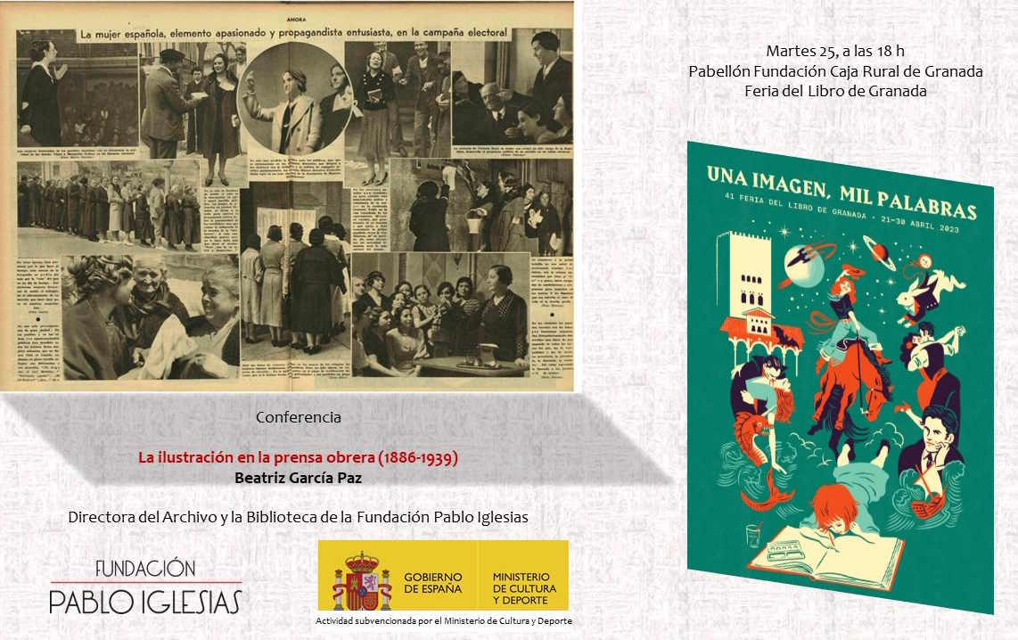 El martes 25, a las 18:00 h, en el pabellón Fundación Caja Rural de Granada, la directora del Archivo y Biblioteca de la Fundación Pablo Iglesias, Beatriz García Paz impartirá la conferencia La ilustración en la prensa obrera (1886-1939).