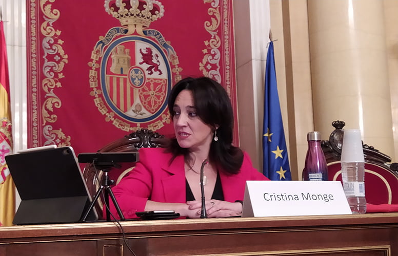 Desde el Antiguo Salón de Sesiones del Senado, Sergio Cuesta, Cristina Monge y Daniel Vicente Viondi participan en la mesa redonda sobre la transicion ecológica.