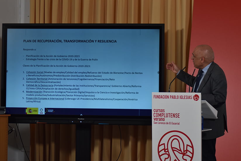 Luisa Carcedo, presidenta de la Fundación Pablo Iglesias, y Félix Bolaños, ministro de la Presidencia, Relaciones con las Cortes y Memoria Democrática, inauguran el curso de verano «Next Generation EU» en el Real Centro Universitario Escorial María Cristina en San Lorenzo de El Escorial. A Continuación, Rafael Simancas, secretario de Estado de Relaciones con las Cortes, comenzará en ciclo de conferencias con «El Plan de Transformación y Resiliencia de España, una oportunidad histórica para transformar España«.
