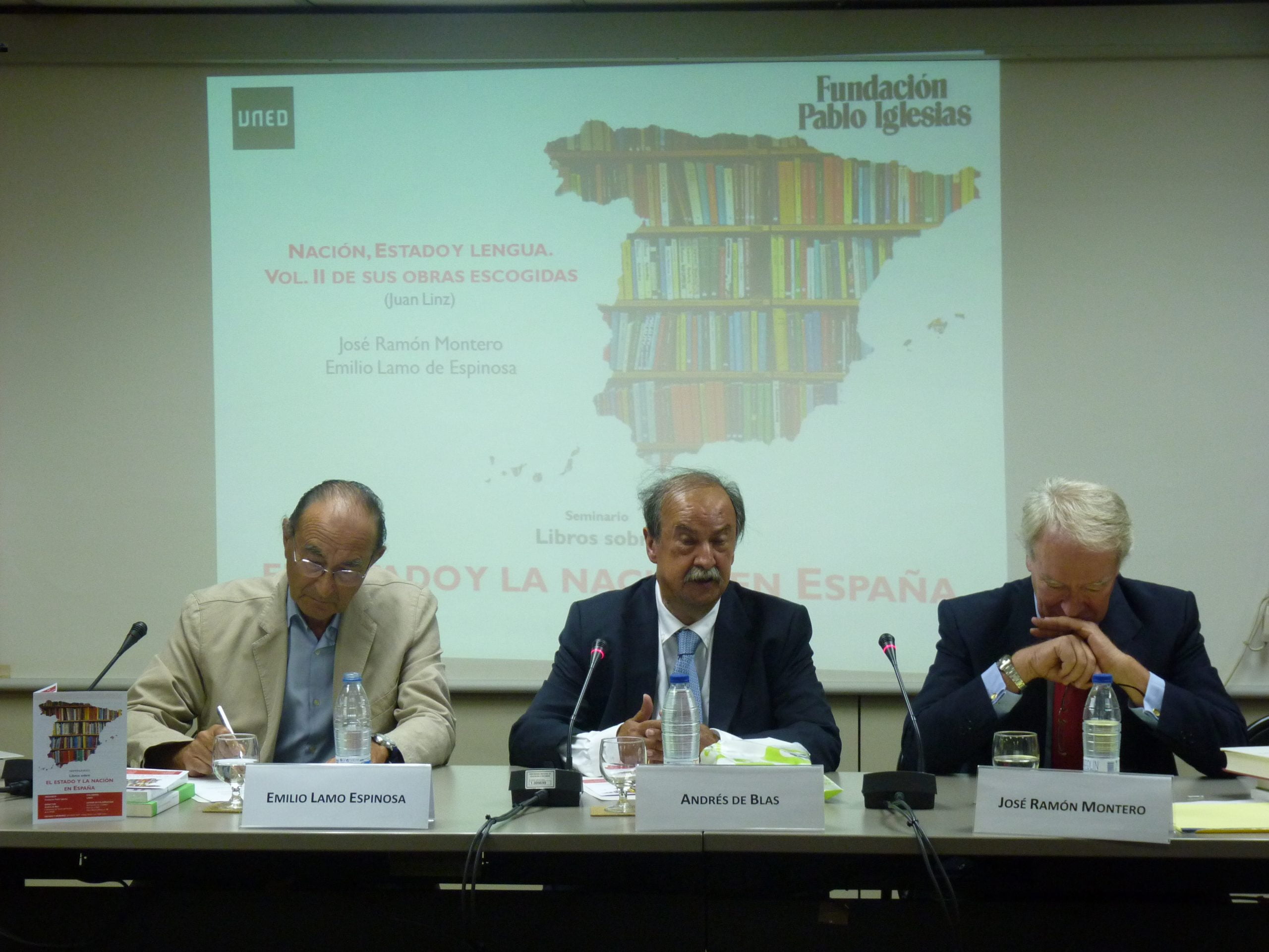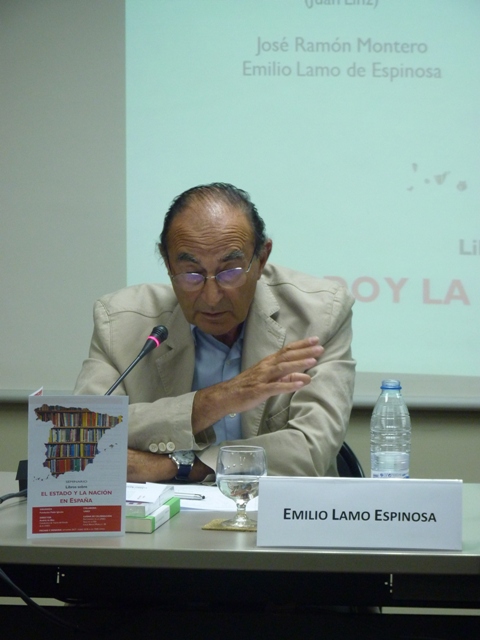 A continuación, José Ramón Montero, Catedrático de Ciencia Política de la UAM y Emilio Lamo de Espinosa, de la Real Academia de Ciencias Morales y Políticas, presentan la sesión dedicada a Nación, Estado y Lengua de Juan Linz.