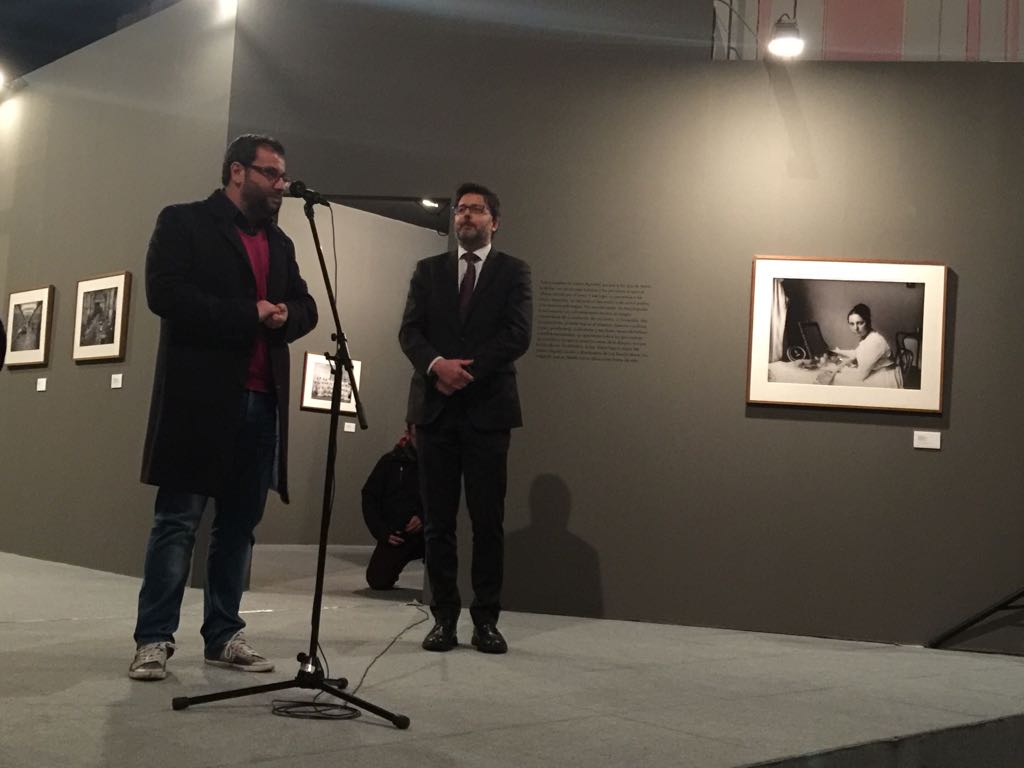 Ibán García del Blanco, Director de la Fundación Pablo Iglesias, José Raúl Fernández del Castillo, Delegado del Rector para Cultura, Ciencia y Cooperación y Lucía Marín hija del autor inauguran la exposición Marín en la Sala Caracciolos de la Universidad de Alcalá de Henares.