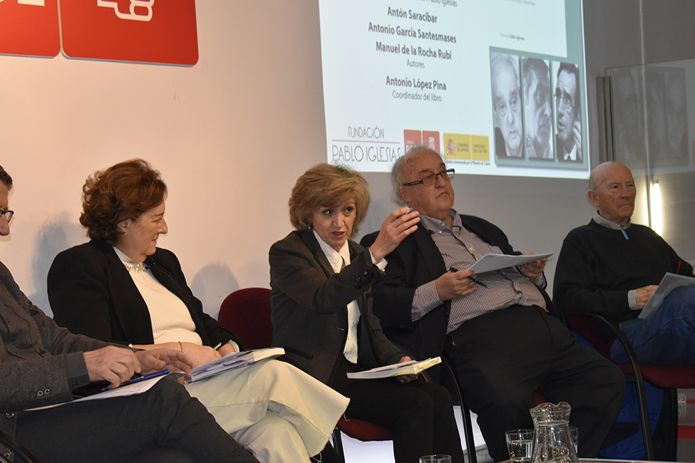 Intervienen: Luisa Carcedo Roces. Presidenta de la Fundación Pablo Iglesias, Antón Saracíbar, Antonio García Santesmases y Manuel de la Rocha Rubí (autores) y Antonio López Pina. Coordinador del libro.