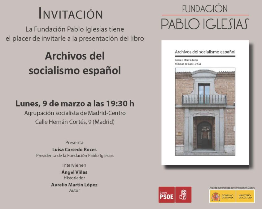 El próximo lunes 9 de marzo de 2026 a las 19:30 h, presentaremos el libro Archivos del socialismo español, en la Agrupación Socialista de Madrid-Centro. Calle Hernán Cortés, 9 (Madrid).