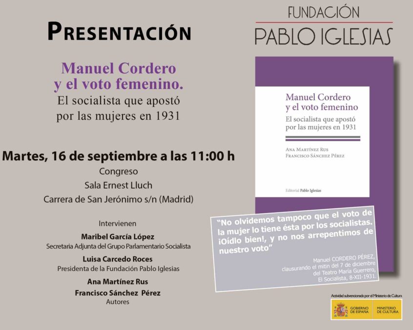 Evento relacionado: Presentación del libro "Manuel Cordero y el voto femenino. El socialista que apostó por las mujeres en 1931" en el Congreso de los Diputados