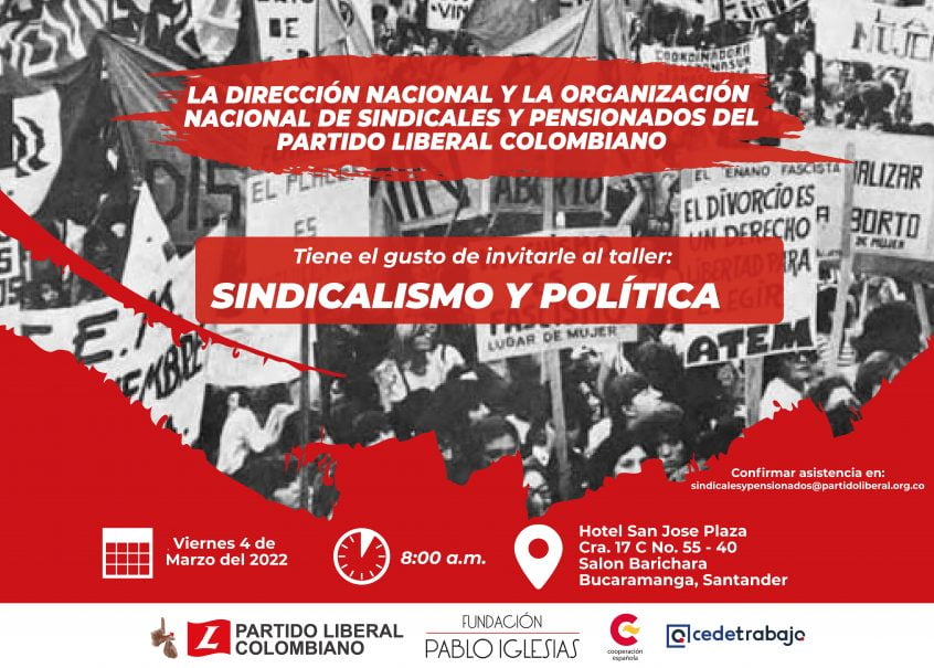 El próximo viernes 4 de marzo a partir de las 9:00 h hora Colombia, las 15:00 h peninsular, celebraremos la segunda edición de talleres que se impartirán para dirigentes de organizaciones sindicales y pensionistas, organizaciones sociales y de base del Partido Liberal Colombiano, en la ciudad de Bucaramanga.